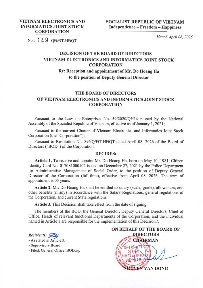 Bổ nhiệm Ông Phạm Hà Duy giữ chức vụ Phó Tổng Giám đốc Viettronics kể từ ngày 08/4/2026