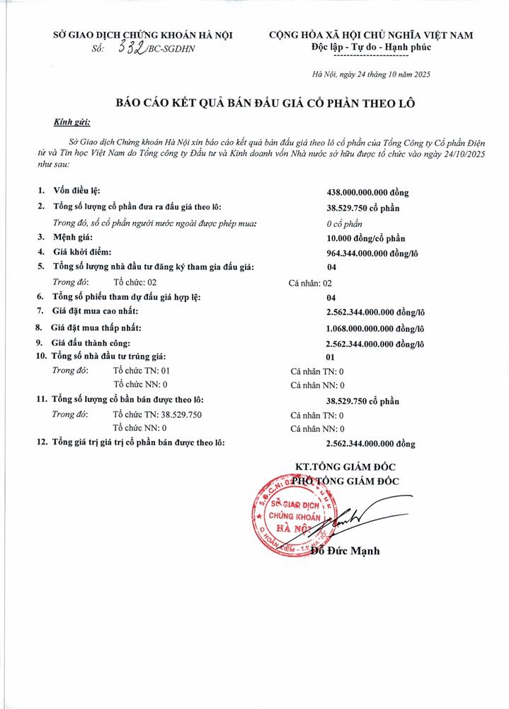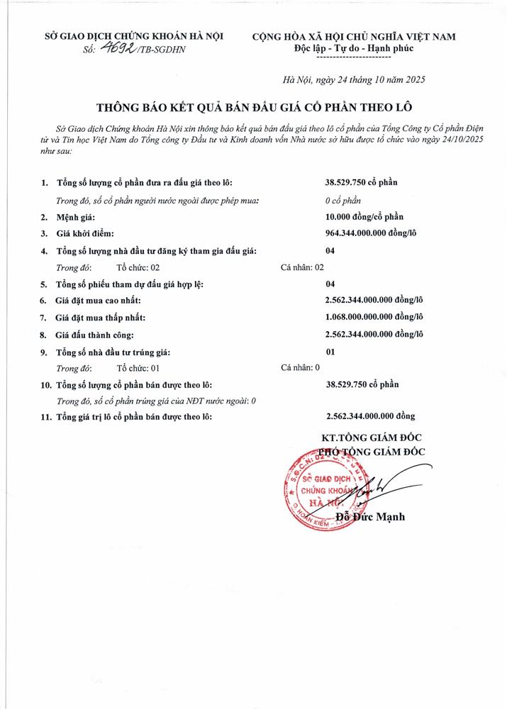 • Thông báo Đấu giá cả lô cổ phần Tổng Công ty CP Điện tử và Tin học Việt Nam do SCIC sở hữu (26/09/2025)