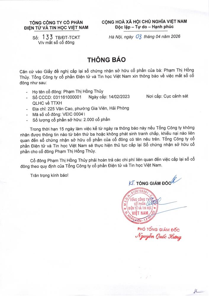 • Thông báo mất sổ cổ đông bà Phạm Thị Hồng Thuỷ